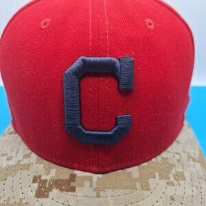 The Cleveland Indians Hat Cap is a fitted 59Fifty MLB baseball cap by New Era in size 7 5/8. This official licensed cap in red is perfect for male fans of the Cleveland Guardians, featuring the team's logo and representing the Major League Baseball league. Made in the United States, this cap is ideal for wearing during the regular season games to support your favorite team and sport.