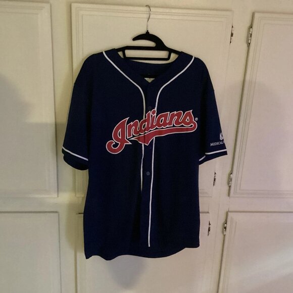 The product is an XL blue Cleveland Indians Omar Vizquel MLB baseball stadium giveaway jersey by the brand Match Up. This officially licensed jersey is for men and is designed for the Major League Baseball season. It features the player's name and the Cleveland Guardians team logo, making it a great collectible item for fans of the team. Made in China, this jersey is perfect for showing support for the Cleveland Guardians while representing Omar Vizquel.