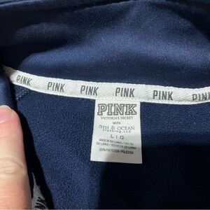 The product is a Pink Victoria's Secret jacket featuring the Cleveland Indians (now known as the Cleveland Guardians) logo. This 2015 jacket is in size L and is designed for women. The jacket is in a blue color scheme, making it a stylish and comfortable piece for female fans of Major League Baseball and the Cleveland Guardians team. Made in Sri Lanka, this officially licensed MLB apparel is a must-have for any fan looking to show their support for their favorite baseball team.