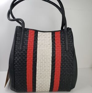 Clever Carriage Black Red & Ivory Striped Weaved Leather Beautiful Shoulder Bag