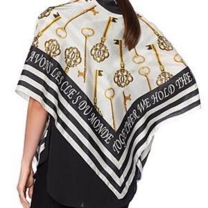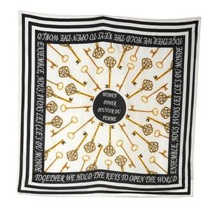 Together we hold the keys to open the world" in English and French. It is a reminder that when women stand together, we can accomplish anything! Made on luxurious silk, this is the perfect accessory to treat yourself or gift to another powerful woman in your life"