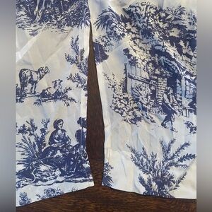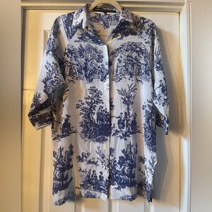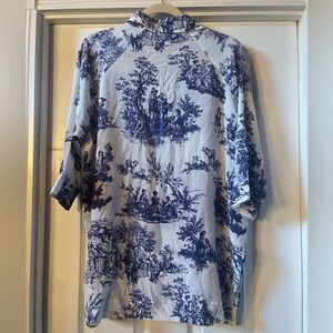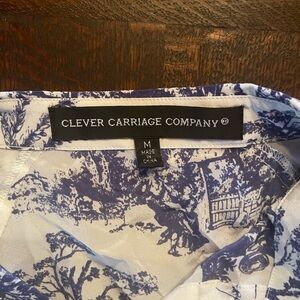 Clever Carriage Company silk shirt. EUC Size M Paris Toile print. 100% silk. Oversized. 3/4 sleeves. Fabric panel covered front buttons. Side slits.