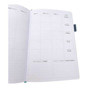 Crafted with meticulous attention to detail, this Clever Fox Weekly Planner offers a premium planning experience. Its elegant blue hardcover and practical elastic band closure ensure durability and sophistication. The 100% recycled paper reflects a commitment to sustainability. Perfect for organizing your weeks, setting goals, and reflecting on achievements.