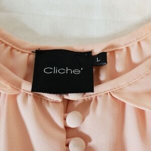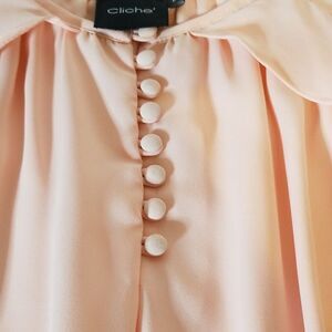 Pretty flesh-tone cold shoulder blouse with fun bell sleeves and a partial button front! Perfect for casual or office wear!