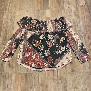 Cliche Women Large Boho Peasant Black Floral Ruffle Off The Shoulder Blouse Top