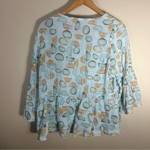 Click Color Me Cotton Linen Peplum Button Front Abstract Sage Green Blouse Large