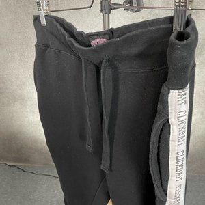 Black sweats / joggers with a white stripe down each side with the words clickbait multiple times. David Dobrik merch.