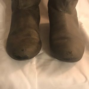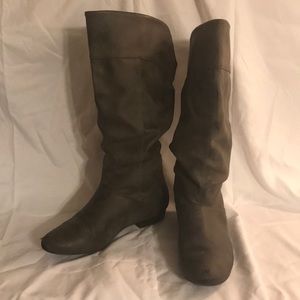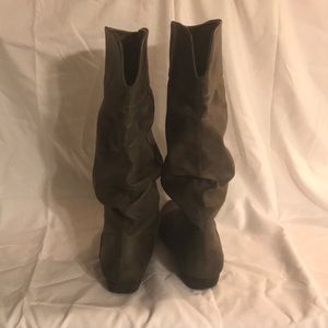 Lightly worn, calf-height, gray boots. Signs of wear on toes (shown in photo). Size 7.