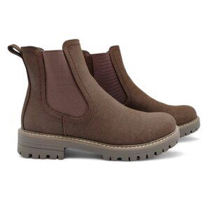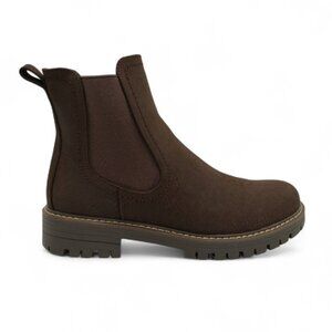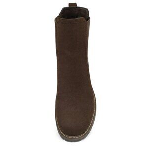 The Cliffs by White Mountain Mastery is a comfortable, classic Chelsea ankle boot featuring a dark brown micro suede leather upper, elastic side gore panels for easy slip-on/off, a cushioned footbed for all-day cushioning, and a chunky lugged rubber outsole for traction and stability. It has a low 1.5 inch block heel and a 5.25 inch shaft height, making it versatile for casual fall or winter outfits like jeans or dresses.