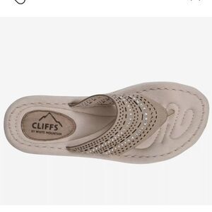 The Cliffs By White Mountain Women's Comate Sandal in size 7.5 features a slip-on style with a thong design, adorned with stone accents on the black synthetic upper material. The sandal has a synthetic lining and insole for comfort, along with a synthetic outsole for durability. This fashionable sandal is perfect for casual wear and is designed with a wide width (W) for added comfort. Made in China, this stylish sandal offers a blend of comfort and style for women on the go.
