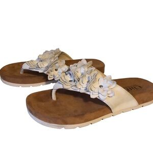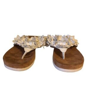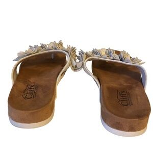 The comfortable cushioned Cliffs by White Mountain flip flop sandal boasts a synthetic upper with beautiful floral appliques! Synthetic lining and insole. Terris Thong Sandal from Cliffs by White Mountain in white with silver-tone detailing, tan insole and white outsole. A delicate, feminine comfort style. Open-toe, slip-on sandal with flower and stud detailing. Soft and molded suedette footbed, comfort cushioned insole and sporty outsole.