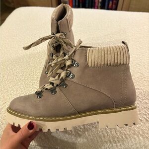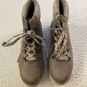 Stylish taupe ankle boots. Features lace-up design. Comfortable ribbed collar. Durable sole for traction. No tags but new, never worn