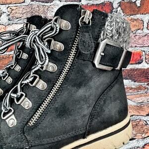 Black faux suede combat lace-up boots with thick knit black and white trim.