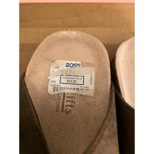 Features: Brown suede finish, double strap design, buckle detail, cork footbed