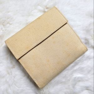 Elevate your accessories with this authentic Céline wallet, crafted in Italy. Designed in a sophisticated beige canvas with smooth brown leather interior, this wallet is both timeless and practical. Features Céline’s signature oval logo plaque on the front flap, and multiple compartments inside for cash, cards, and coins.