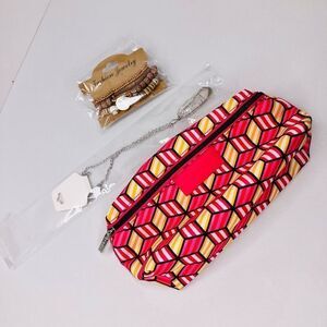 Clinique Geometric Pouch Silver Necklace & Wooden Bracelet Bundle