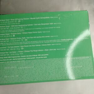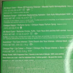 - All about clean rinse off foaming cleanser 1oz/ 30ml- Moisture surge 100H auto replenishing hydrator .5oz/ 15ml- Clinique Happy spray .14oz/ 4ml- All about eyes eye cream .17oz/ 5ml- Quickliner for eyes intense black- Clinique Pop lip colour plum pop