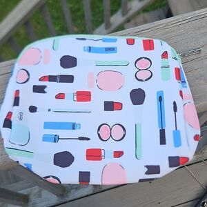 Adorable limited edition Clinique × Kate Spade cosmetic bag featuring a fun makeup-themed print. White background with colorful lipsticks, brushes, and compact designs. Zipper top with silver “Clinique” pull tab. Light green interior lining made of recycled polyester.