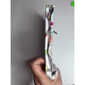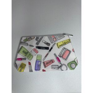 Cute Clinique zip cosmetic pouch with an all-over beauty product print. Wipeable exterior and lined interior—perfect as a purse organizer or travel toiletry bag. Gently used; zipper runs smoothly. Light marks inside from normal use (see photos). Smoke-free home.