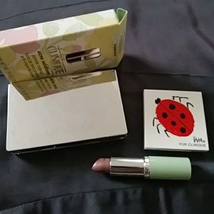 Clinique acne solution powder makeup 24 golden .35 Oz metallic mirrored makeup cover case. Clinique ladybug eyeshadow palette 09 smoke and mirrors single Shadows. 08 Cupid flush and 21 silverlining. Bamboo pink lipstick
