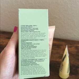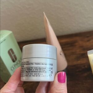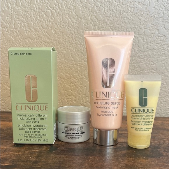 All brand new Clinique bundle. Includes dramatically different 4.2 fluid ounce moisturizing lotion with pump, clinic dramatically different moisturizing lotion one fluid ounce, Clinique smart night custom repair moisturizer .5 ounces and Clinique moisture surge overnight mask 3.4 ounces.