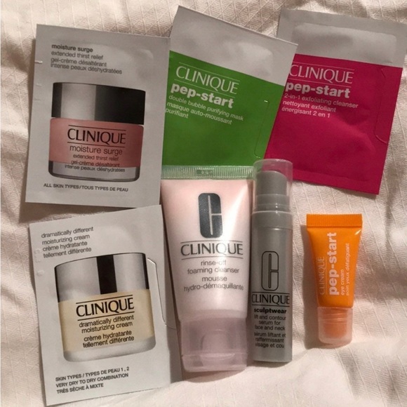 Clinique sample bundle. See pics. Includes pep start minis, sculptwear, rinse-off, and moisturizer.