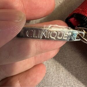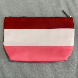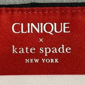 Clinique x Kate Spade cosmetic bag. Measures 9.5" x 6" x 2.5". Red, white and pink colorblock design with the wording "hello, gorgeous." Bright and colorful, great to hold items in your handbag -- you'll easily be able to spot this.