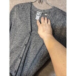 This is a Clio duster cardigan for women in size Small. It is gray in color with a short V-neck and long sleeves. The cardigan is made from a blend of silk and cotton. It features a button-up closure and falls under the styles of hipster, bohemian, and classic. The cardigan has a sleek and elegant design suitable for various occasions.