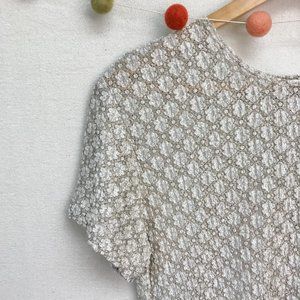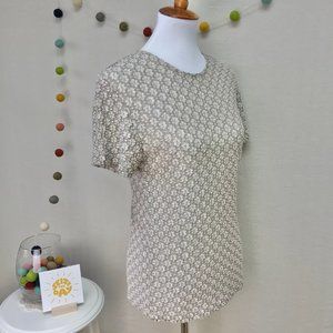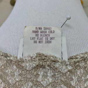 I love this top! Career casual, beautifully textured, great for layering! Somewhat sheer (see pics). Satiny finish and good amt of stretch. Pre-loved condition, a lot of life left!