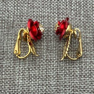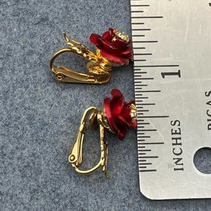 Clip On Earrings Red Rose Gold Leaf Rhinestone Center Flower Classic Granny