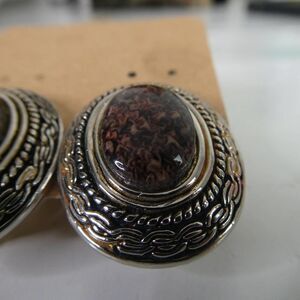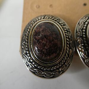 Beautiful pair of clip on earrings. Oval with interesting swirly cabochon(unsure of material, sorry), twisted and braided rope detail around the edges. Put on card by me.