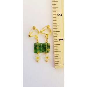 Clip on Earrings Green with White and Yellow Daisy Millefiori 1 Inch gold tone