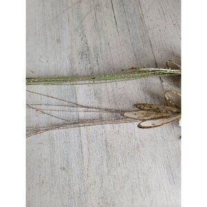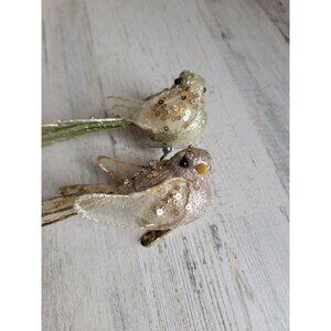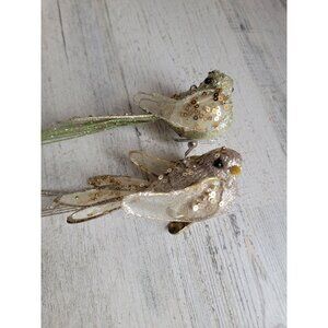 Product green bird missing beak, some back feather branches have mild glitter fraying, mild scratches and marks but otherwise in good condition, set of 2