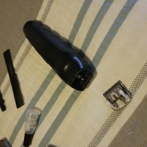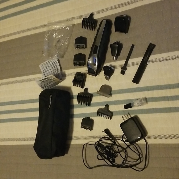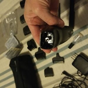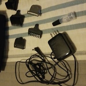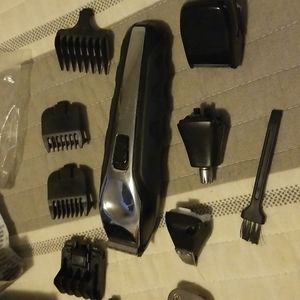 Electric clippers with multiple heads and attachments for detailed trimming use. Includes cleaning brush, oil, small comb, and storage pouch. See photos for details.