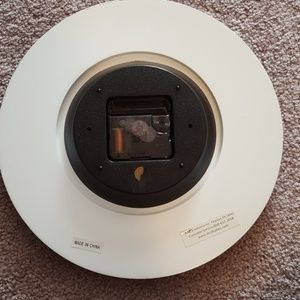 A clock that has never been used. Silver hands with a plastic back that looks like marble.