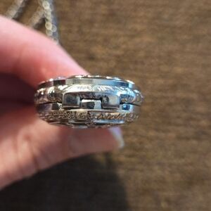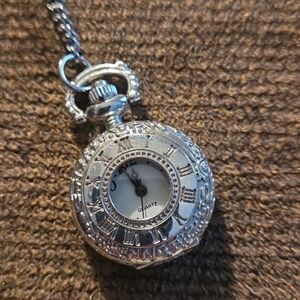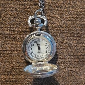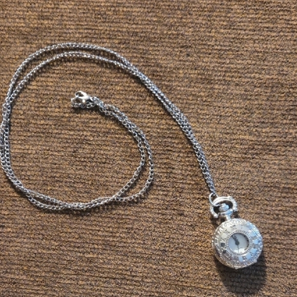 Beautiful antique-style clock necklace on 24" chain. Floral detail on back and Roman numerals on front. Top button pushes down to pop open front clockface. Battery is good, watch functional (battery pin pulled up to preserve battery, needs to be pressed down upon receipt).