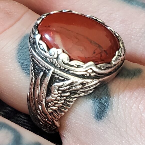 Clocks and Colours 925 silver ring with unique red jasper stone, lightly worn, size 10.