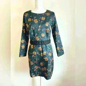 Clocolor Navy Floral Long Sleeve Fitted Embroidered Brocade Dress