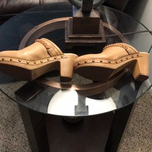 I think they are true to size. I wear a 7 1/2 and with these I can wear a pair of socks. Without socks a little of the shoe is showing in the back but doesn’t bad. These are man made material the heel look wooden.