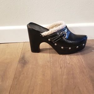 Black heeled fashion clogs with fur