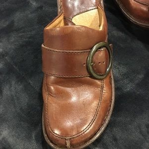 Leather tan/brown color with buckle style, couple scuff line on toe of clog,