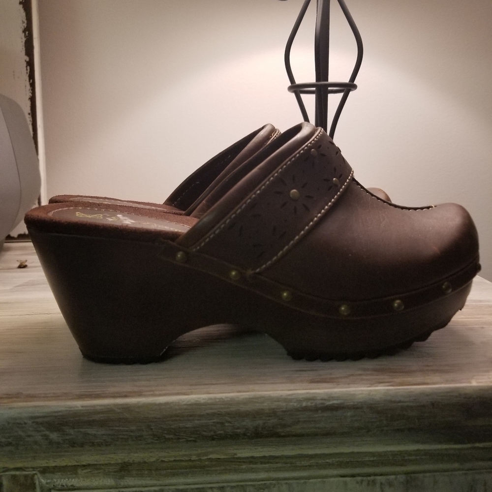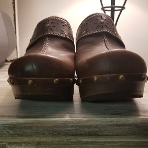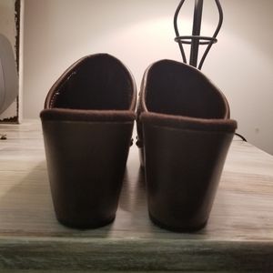 Brown clogs with wooden raised heels with rubber type traction for walking. Wore only once in good shape. Size 6.