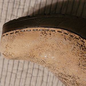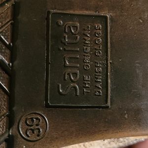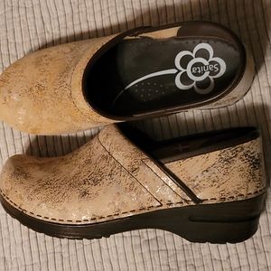 Sanita clogs. Light mustard yellow with gold accents and brown sole. Light wear on front of shoes. Worn maybe a dozen times. Very well taken care of.