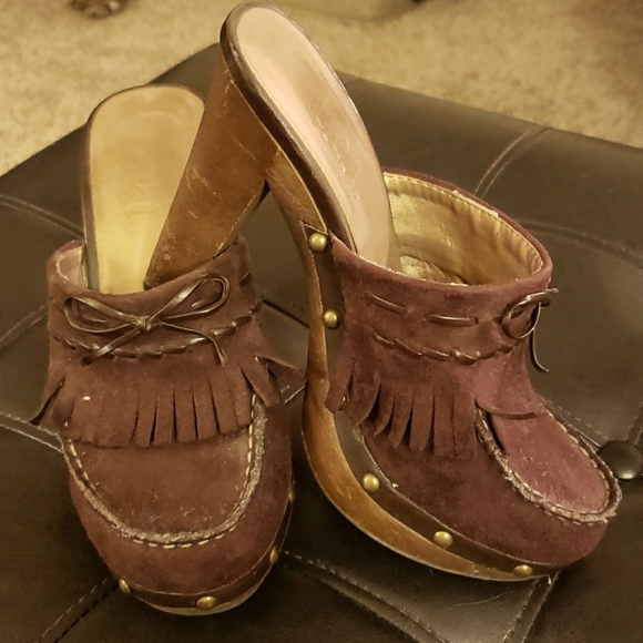 Cute 4" heel brown suede look clogs. These have fringe and bow detail with brass rivets.