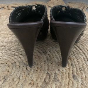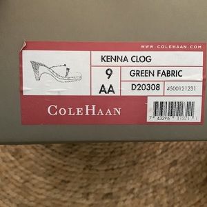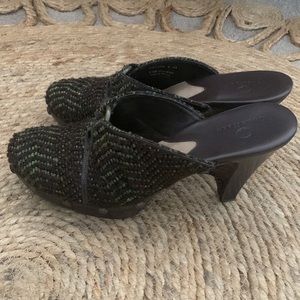 Green and brown tweed clog. Brass studs along bottom. Worn once