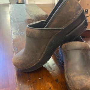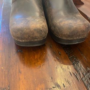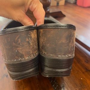Brown leather clogs in very good condition. Worn only a few times. The brown leather is made to look weathered.