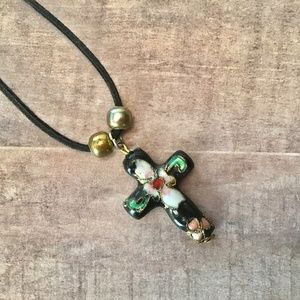 Can be adjusted to be worn longer, lobster clasp, Christian, Catholic, religion, boho, bohemian, gift, leather, bead, cross, leather, suede, cloisonné, enamel, gold finished copper, flower and leaves design, black, green, red, white, floral