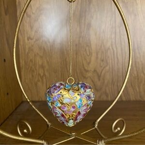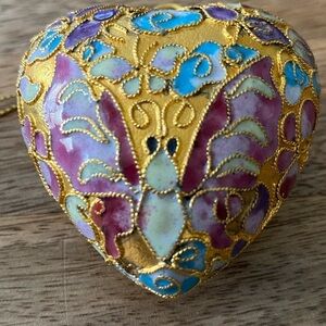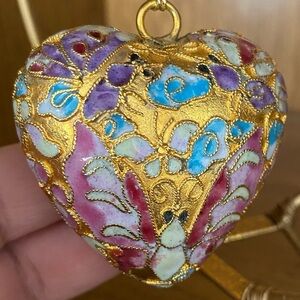 Lovely Cloisonné Gold with Butterflies and flowers Heart Shaped Ornament, Intricate 2.5"