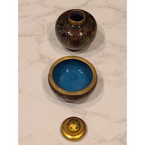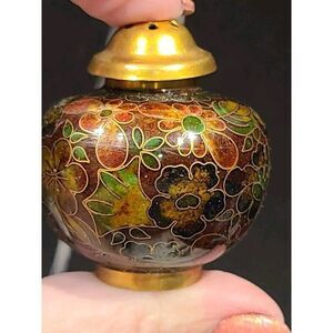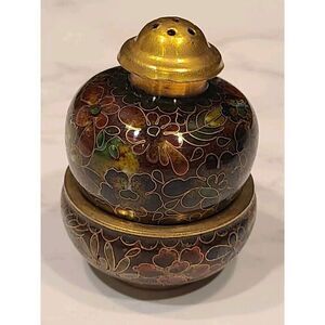 Vintage Cloisonné Open Salt Bowl Cellar Pepper & Shaker | Brown, Green and Orange Colorway | Flower Design Enamel Brass Stacking | 2.5"H x 1.75"W | Excellent Used Vintage Condition | Please refer to the photos for the condition.