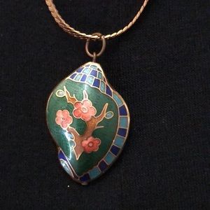 Gorgeous Vintage Cloisonné Conch Shell shaped Pendant on Gold Herringbone Chain. Pendant is Green with Cherry Blossom Design. Beautiful Vintage Piece in Excellent Condition. Same pattern each side of pendant, first 2 photos show both. Approximately 18" Length Chain.